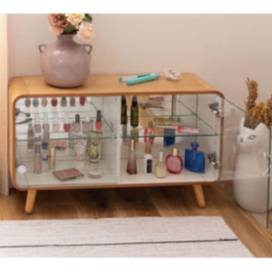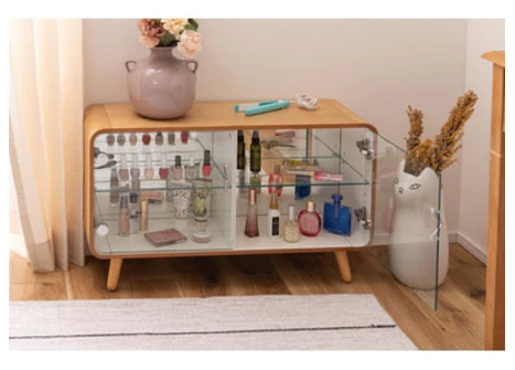 採用曲木圓角造型安全R角,中間隔開分成左右兩邊空間,兩片強化玻璃門組立完成